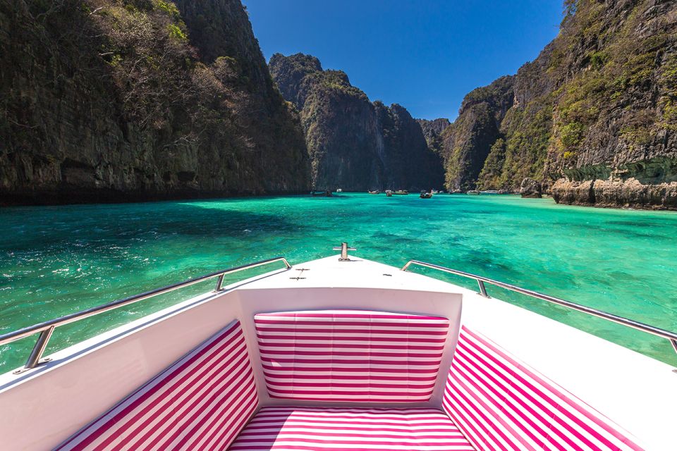 Relax on the white sand beach and explore Maya Bay on your own. As you stroll, appreciate the restoration work around the bay, before heading to Pileh Lagoon, an uninhabited national park. Marvel at this enclosed lagoon’s bright emerald waters encircled by towering limestone cliffs.